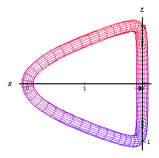 Finally, we'll rotate the z -axis forward (Figures 6a, 6b, 6c) until we can see the projection of the curve in the xy -plane (Figure 6d). As it should, y falls between -1 and 1, and x is between 0 (actually about 0.0001) and 2.