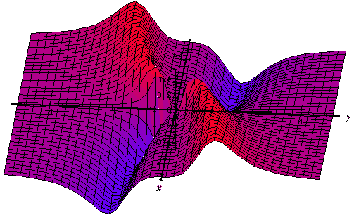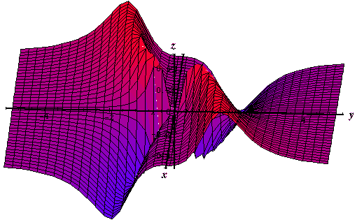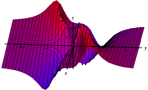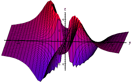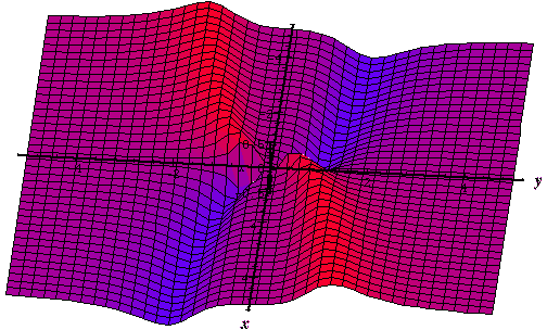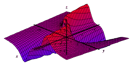 A plot of this appealing surface is shown in Figure 9a. Again, the activity is to look at the surface from many points of view. See Figures 9b and 9c. We can see that something fairly precipitous is happening near the origin, and that the function nears a different value along the ridge than it does along lines of approach to the origin. (It also tends to a different value along the trough, but we'll concentrate on the ridge.) To get a better look at the ridge, we'll rotate the z -axis forward. See Figures 9d, 9e, and 9f. We hope this leads students to recognize the ridge curve